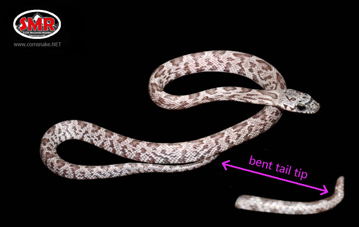 This 11" 2020 male Shatter (Sunkissed Cinder) is currently eating frozen/thawed ONE-DAY-OLD pinky mice. I've never known kinking this far from the cloaca to negatively impact breeding, nor do I suspect that this is heritable. $91.00 plus $39.00 flat-rate domestic overnight shipping to any of the lower-48 U.S. zip codes.