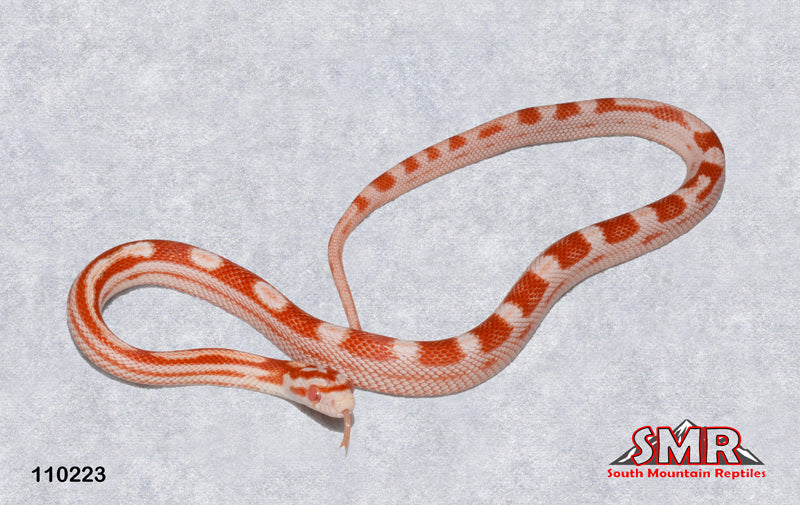 This 12" 2023 female Amel is currently eating frozen/thawed small pinky mice. She satisfies the color theme of Candy Cane and the pattern scheme of either Stripe or Motley, but I'm leaning toward Stripe--since all of her siblings were striped (no motleys)? Yes, her dorsal stripe is narrow, but the shapes of the red markings are more like those of Striped mutants than Motley??