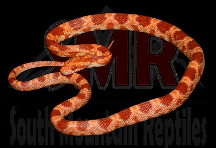 This 2021 female Amel cornsnake is 17" long, eating small frozen/thawed pinky mice. Since both parents had at least one of the paired Red Factor gene copies, she should be a Red Factor visual-het. $141.00 plus $39.00 domestic overnight shipping to any U.S. zip codes between Canada and Mexico.