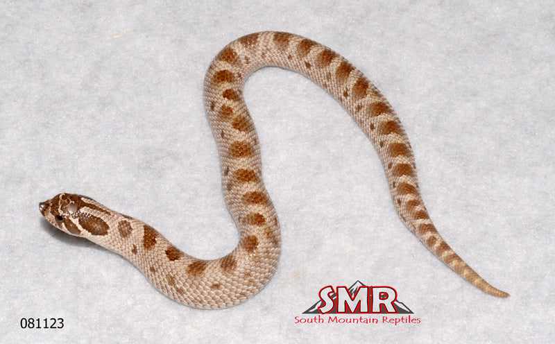 This 2023 7" female Anaconda Western Hognose is currently eating unscented frozen/thawed 1-day-old pinky mice. She is possibly het for Toffee Belly. One of her parents had nice green markings.