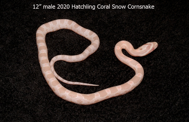 This 2020 12" Male Coral Snow is currently eating frozen/thawed ONE-DAY-OLD pinky mice. It appears that he has only one of the paired gene copies of Red Factor, but at this tender age, he could demonstrate that he has both paired gene copies (therefore, COULD demonstrate that he is a Red Factor homozygote) in a few months. $99.00 plus $39.00 flat-rate domestic overnight shipping to any of the lower-48 U.S. zip codes.