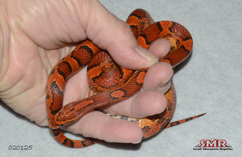 This SMR 32" Female sub-adult Red Extreme Okeetee cornsnake is currently eating frozen/thawed fuzzy mice.