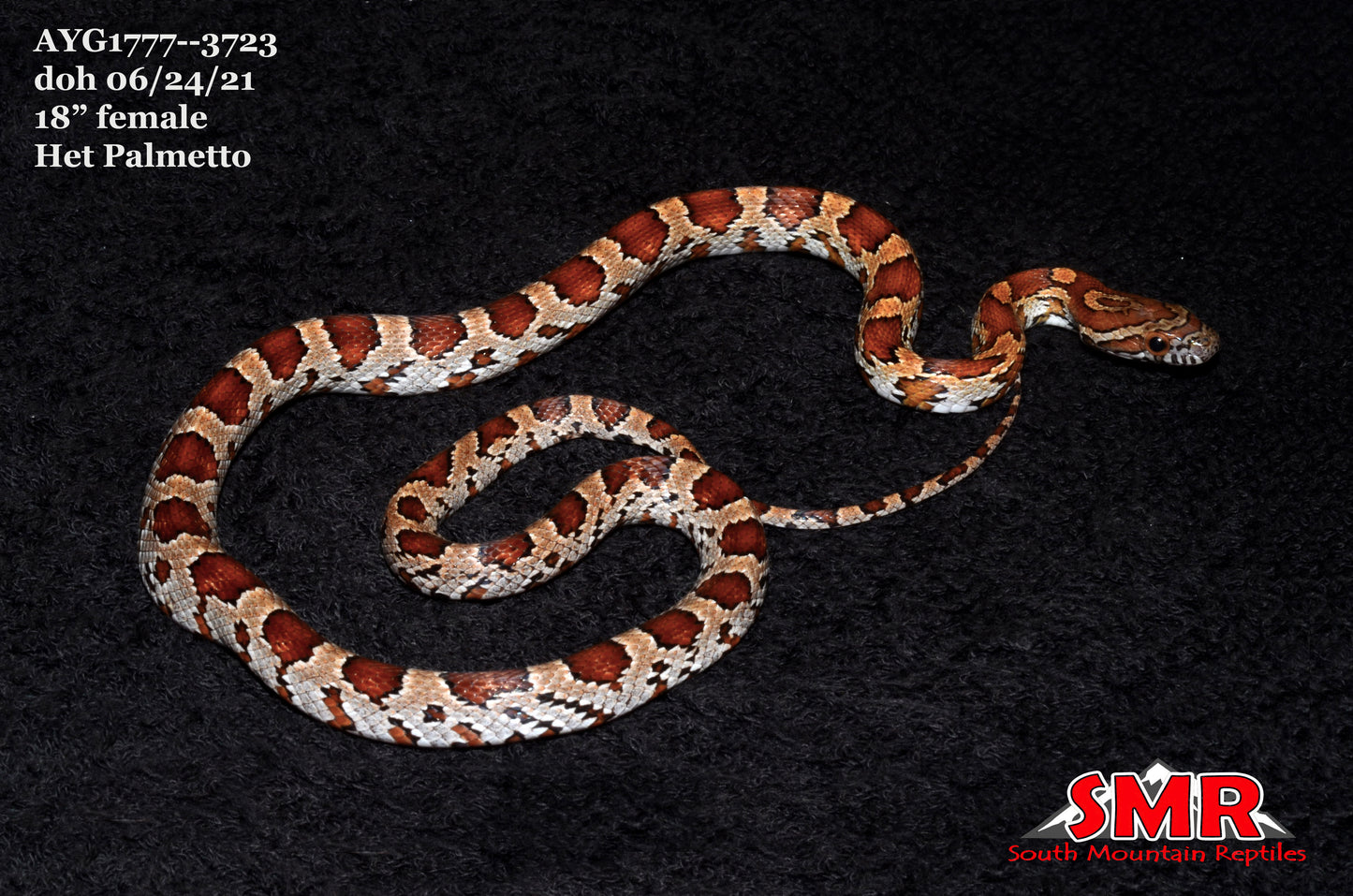 Parents of this 18" female 2021 cornsnake are a Palmetto and an Alabama locality corn. The Palmetto parent is het for Anery, but if you seek to reduce hobby mutations in Palmetto projects this would be a good start, since the Alabama wild-type has no hets? $226.00 plus $39.00 flat-rate overnight domestic shipping to any of tlower-48 U.S. zip codes.