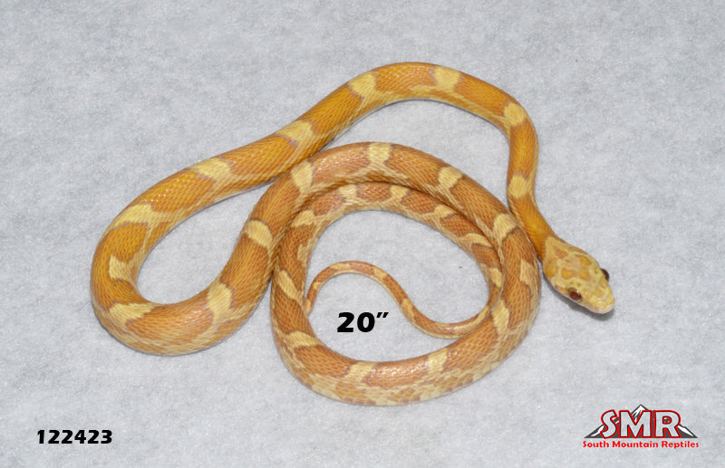 This 20" female 2022 Lemon (Caramel Sunkissed Hypo) is 66.6% possibly het for Amel. She is currently eating frozen/thawed large pinky mice. $39 flat-rate overnight shipping for all SMR snakes.
