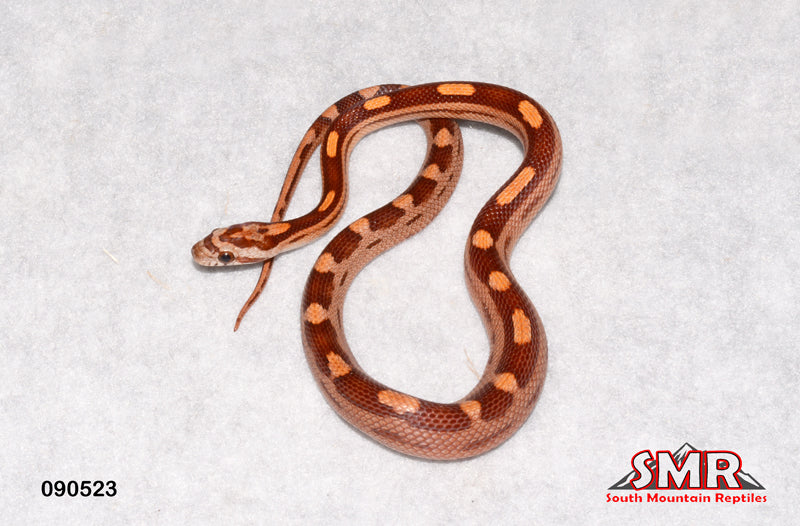 This 13" male 2023 Red Factor Motley is currently eating frozen/thawed small pinky mice. Flat-rate $39.00 overnight shipping applies to all snakes sold at SMR.