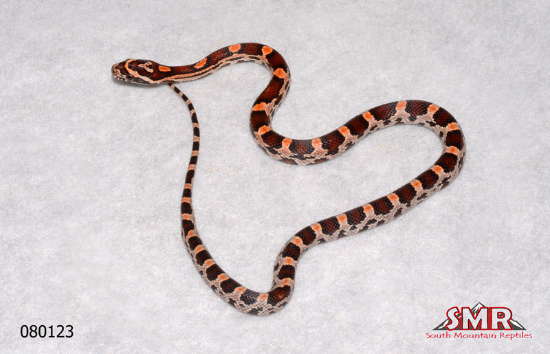 This 13" female 2023 Red Extreme Okeetee is currently eating frozen/thawed 1-day-old pinky mice. She does not possess any gene copies of red-modifying mutations, but will have a nice red over-wash at maturity.