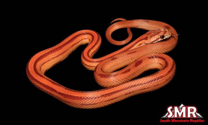 This 20" female Striped corn snake is 66.6% possibly het for Scaleless, Red Factor, and Amel. I'm not pricing him as such, but I'm pretty sure he is a Visual Het Red Factor? He is currently eating medium frozen/thawed pinky mice. $186.00 plus $39.00 flat-rate overnight domestic shipping to any of the lower-48 U.S. zip codes.