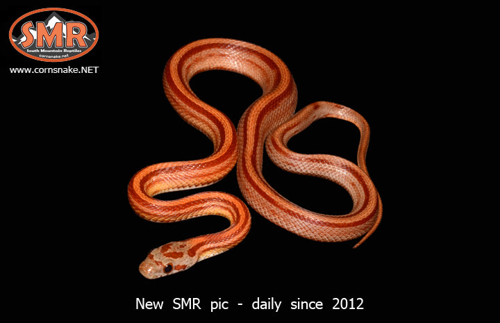This 16" male Striped corn is het for Amel, Stripe, Bloodred, and one of his parents was an Amel Buf. He is currently eating frozen/thawed pinky mice. $195.00 plus $39.00 flat-rate overnight domestic shipping to any of the lower-48 U.S. zip codes.