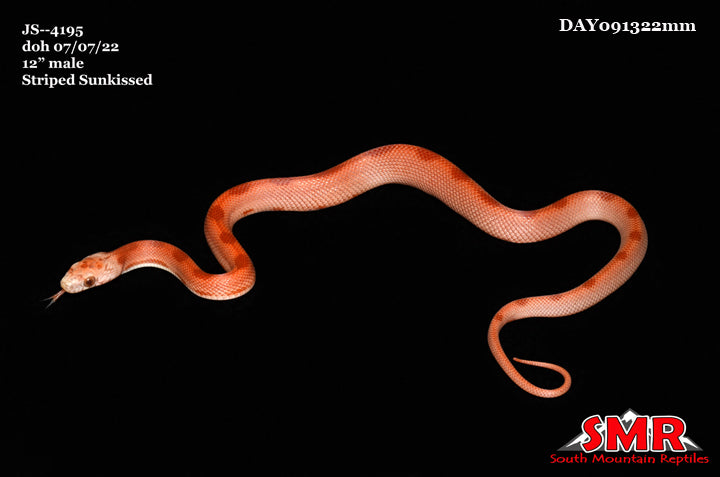 This 2022 male Striped Sunkissed cornsnake is currently 12" long, eating 1-day-old frozen/thawed pinky mice. $216.00 plus $39.00 domestic overnight shipping to any of the lower-48 U.S. zip codes.