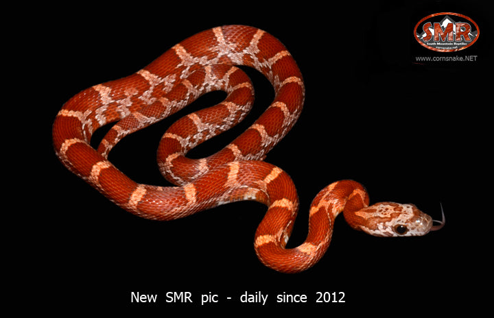 This 17" female Sunkissed is from parents of corns that are het for Cinder, Sunkissed, and Lava--so, she is possibly het for Lava and Cinder. I stop short of saying she may already be Lava, given the reddening of the markings? She is currently eating frozen/thawed pinky mice. $171.00 plus $39.00 flat-rate overnight domestic shipping to any of the lower-48 U.S. zip codes.