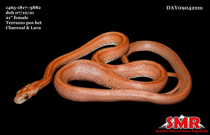 This 19" female Terrazzo is currently eating frozen/thawed Large pinky mice. She is 66.6% POSSIBLY het for Charcoal and Lava.