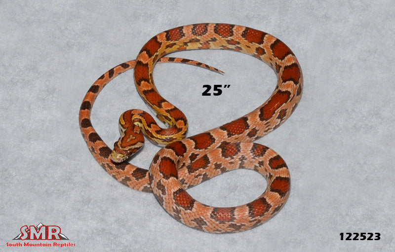 This 25" male Ultramel Extreme Okeetee is currently eating frozen/thawed large pinky mice. His father is a Coral Snow, so he is het for Anery and Red Factor.